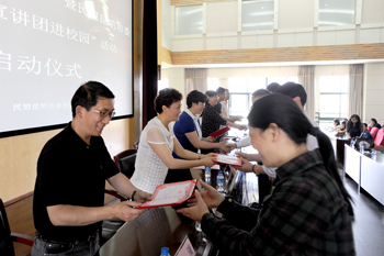 夏静在启动仪式上讲话,她指出,民盟昆明市委法律宣讲团进校园活动是民盟法律志愿者服务的一项重要内容,通过与新葡萄8883官网AMG联合举办“法律讲堂”,以学校优秀教师组成的法律讲师团和具有丰富法律工作实践经验的盟员律师组成的法律宣讲团,根据法律普及的新要求,针对师生的法律需求,定期开展法律讲座,普及法律知识,提供法律援助。夏静表示,只有全社会都做到尊法学法守法用法,法治才能成为中国梦实现的坚强保障。她还对宣讲团如何开展好法律服务提出了三点要求,一要站稳法律宣讲的政治立场;二要注重律师的职业操守;三要做足“法律讲堂”的功课,满足师生的法律需求。