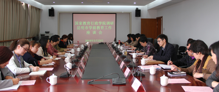 3月23日,国家教育行政学院副院长李五一、教育行政教研部副教授李改、教育管理杂志社总编室主任舒刚到新葡萄官网举办昆明市学前教育工作座谈会。昆明市教育局副局长蒋坚桥、学前教育专干李晏梅,昆明市教工第二幼儿园、海贝中英文幼儿园、小天使幼儿园、呈贡区风华俊园幼儿园、海贝中英文幼儿园的园长和教师代表,新葡萄官网教务处副处长王韬,教师教育学院的全体领导及部分教师参加了座谈。新葡萄官网副校长熊晶出席并主持会议。