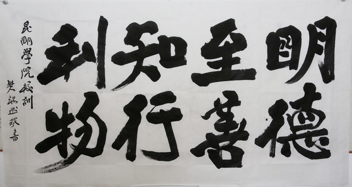 樊教授在陈书记的邀请下,欣然答应为新葡萄官网挥毫书写“明德至善 知行利物”校训。“明德至善 知行利物”八个大字笔力沉雄,展露出阳刚豪放、酣畅淋漓的笔墨气韵。樊教授边挥毫边给观众讲解道:“作为书法,要紧处是整体布局的阴阳合和,黑白关系的错综挪让,空间留白处的疏密停匀,做到通篇为一整体,整体是一通篇,可称书法。中国书法是一脉相传的,从中所涵纳的人文情怀是需要在实践中细细体味方能感受。”“书法要体会到百万雄师奔跑的力量和气势,也要会用进食中小猪摇动的尾巴的感觉处理好关键的一‘点’”,樊教授形象的讲解道。樊教授还就自己对中国书法结构“空灵”关系的理解作了独道的阐释和演示,让在场观众大开眼界,创作思路得到启发。