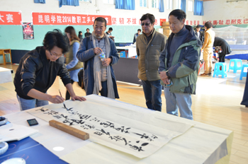 为进一步加强校园文化建设,传承和弘扬中国文化,陶冶师生的情操,感悟中华文化的博大精深、源远流长,按照校长蒋永文提议,在2015年元旦来临之际,由校工会、教务处和教职工书法协会共同举办迎新年“至善杯•首届师生书法大赛”。经过认真筹备,学生组现场书法比赛于12月26日中午在博雅楼2号教学楼前隆重开赛。蒋永文校长出席并致辞。开幕式由学校工会常务副主席孙晓坤主持。