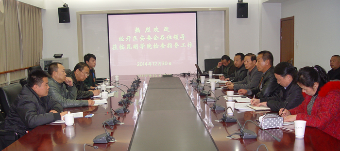 根据昆明经济技术开发区安全生产委员会关于开展2014年度安全生产工作考核的安排和要求,12月30日下午,由经开区安监局局长税康生带队,安监局和综合执法局一行5人组成的督查组对新葡萄官网2014年安全生产、消防、道路交通工作进行综合督查考核。学校分管副校长李翔,保卫处处长方永昆、副处长孙丽、后勤集团副总经理曹全科以及保卫处科以上干部参加考核。考核会在311会议室进行,考核分听汇报、查台帐、看实地三个环节进行。