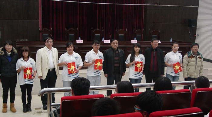 12月12日下午,新葡萄8883官网AMG2014年志愿者表彰会在惟真楼模拟法庭举行。学校党委副书记孙勇,党委宣传部副部长董学荣,学生处处长刘宜萍,校团委副书记魏妮娅、樊传章及100多名志愿者参加了本次表彰会。会议由团委副书记魏妮娅主持。