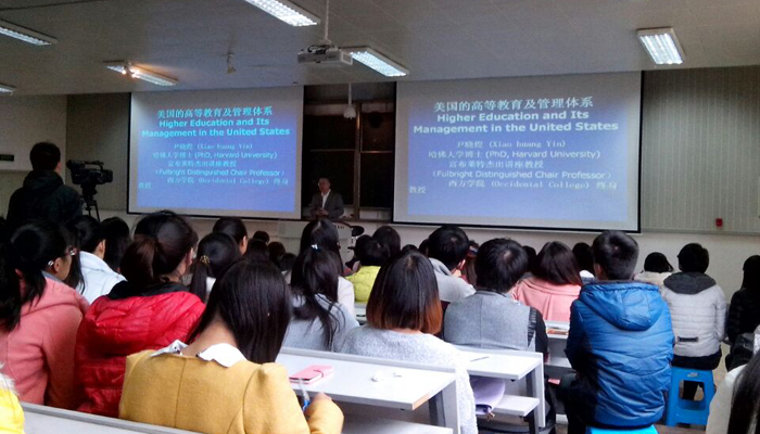 3日上午,尹教授在博识楼1003报告厅作了题为“美国高等教育及管理体系”的讲座。讲座由外国语学院林德福院长和王云秀副院长共同主持,外国语学院师生及部分外校学者参加了本次讲座。尹教授从美国多渠道、多功能和多元化的教育体制入手,重点为大家介绍了美国三种不同形式的高等院校,即:强调科研的研究型私立高校、以教学为重的文理学院及教研并重的公立大学。此外,尹教授还详细介绍了美国高校的人事制度。