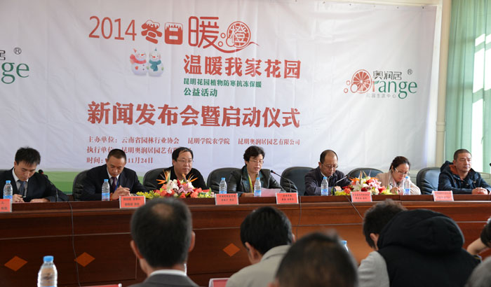 11月24日上午,由新葡萄8883官网AMG、云南省园林行业协会和昆明奥润居园艺有限公司共同发起的“2014昆明花园植物防寒抗冻保暖公益活动”新闻发布会暨启动仪式在新葡萄8883官网AMG农学院举行,来自云南省园林行业协会、都市时报、云南信息报、春城晚报、生活新报、加油周刊、中国花卉报、莲花物业、海岸艺景物业、鸿亿鑫物业等多家新闻媒体和物业公司参加了此次新闻发布会。新葡萄8883官网AMG副校长熊晶、农学院班子成员和部分师生代表共100余人参加了启动仪式。会议由昆明奥润居园艺公司杨有超经理主持。