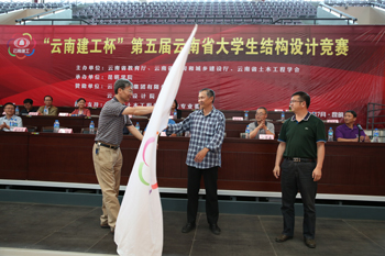 颁奖仪式后,举行承办单位交旗仪式。“云南建工杯”云南省大学生结构设计竞赛主办单位代表云南省教育厅高教处调研员谢怀昆宣布,第六届竞赛承办单位昆明理工大学,并从第五届竞赛承办单位新葡萄8883官网AMG副校长董建华手中接过会旗,交到第六届竞赛承办单位昆明理工大学副校长牛治喨手中。牛副校长接过会旗后挥旗示意,并代表第六届云南省大学生结构设计竞赛承办单位欢迎各高校选手2015年相聚昆明理工大学。