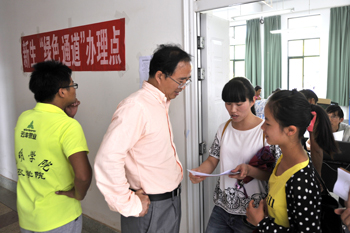 校领导每到一个报到点,都要与到场的各部门负责人和接待的工作人员了解新生报到注册状况,并热情地与前来报到注册的新生及新生家长亲切交谈,关心询问新生们的报到注册情况,及时解决新生接待中遇到的问题。