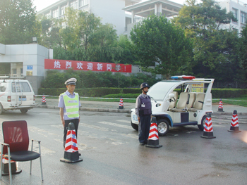 迎新期间,保卫处共抽调保卫干部、保安、学生治安服务队员共81人分成交通安全、报到场地、南门、西门、润泽苑、澄明苑、户籍接待后勤保障7个工作组将工作任务定岗定员层层落实。在校园及周边路段设置醒目的交通引导标志和警戒线,组织安保人员引导新生家长车辆停放,确保校园及周边道路交通畅通、有序;南、西门组严禁校外人员在校门范围内摆摊设点占道经营,维护交通秩序,处置突发事件;加强报到现场收费处的重点守护和巡查,及时清理可疑闲杂人员;对学生宿舍等重点部位进行治安巡查,提醒新生看管好自己的行李和财物。加强反恐防暴工作,设立防恐工作机动中队,配齐装备加强巡逻、警戒,做好应急反恐处突工作。为加大安全宣传教育力度,安全教育从新生进校抓起,保卫处印制了四千份《新生安全提示》,发放到各位新生、家长手中,同时在各学生宿舍门口醒目位置都进行了张贴提示。