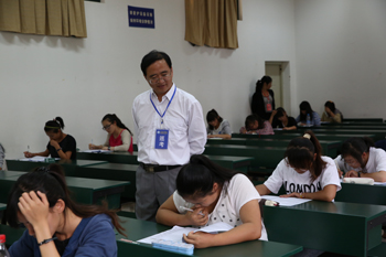 6月27日,本学期期末考试第一天,学校党委书记陈世波、校长蒋永文带队深入考场,对考场秩序、监考人员履行监考职责、考试布置、学生遵守考试纪律等情况进行巡查、督办和指导,确保考试工作严肃、认真、有序进行。