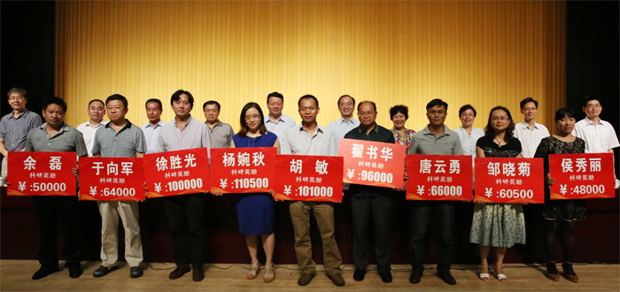 会上,学校党委副书记孙勇宣读了《关于对新葡萄8883官网AMG2011-2013年度科研先进集体进行奖励的决定》和《关于对新葡萄8883官网AMG2013年科研成果获奖教师进行奖励的决定》。决定对生命科学与技术系等10个科研先进集体和在2013年科研工作中取得优异成绩的杨婉秋等222名教师进行表彰奖励。受奖教师占专任教师的20%,发放奖金200余万元。