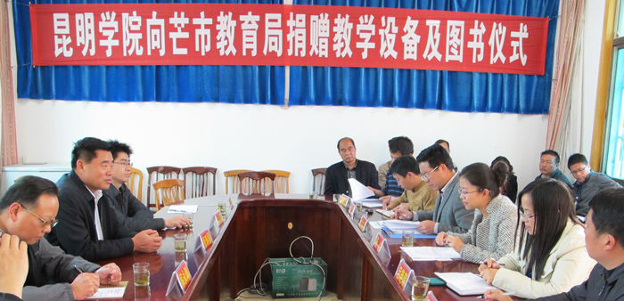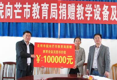 在捐赠仪式上,杨红副市长首先代表市委、市政府对张副校长一行的到来表示欢迎,并对新葡萄8883官网AMG长期的帮扶工作表示肯定和感谢。张寿国副校长总结了学校和芒市近十年“兴边富民工程”建立的深厚友谊和取得的实效,并表示学校在“十二五”期间将按照省委省政府的要求以及学校党委行政的工作安排,结合学校自身优势和芒市教育实际需求,进一步深化强化“兴边富民工程”对口帮扶工作,特别是继续加强对芒海九年制学校的支持力度,力所能及的为芒市教育作出贡献。随后,市教育局左安卫局长介绍了近年来芒市教育的基本情况和主要发展举措,对新葡萄8883官网AMG一直以来的大力支持表示衷心感谢;教科中心姜志和主任根据芒海镇九年制学校教学需求情况,希望新葡萄8883官网AMG在师资培训和教学资金设备上能够继续给予支持。最后,进行了捐赠仪式。
