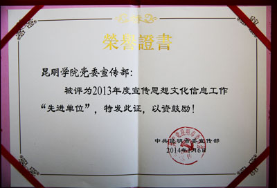 1月6日下午,昆明市宣传文化系统信息工作会议在昆明市行政中心中共昆明市委宣传部召开。会上,市委宣传部对2013年信息工作成绩突出的9家单位进行了表彰奖励,新葡萄官网党委宣传部被评为2013年度宣传思想文化信息工作“先进单位”。荣获这次表彰奖励的“先进单位”有昆明市各县市区相关单位7家,昆明市相关单位、机关相关部门2家,新葡萄官网党委宣传部是受表彰的两家单位之一。同时,党委宣传部负责信息工作的阮力江老师被评为“优秀信息员”,受到市委宣传部表彰。