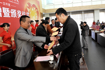 12月25日下午,新葡萄8883官网AMG2013年度“红云园丁奖”“红河助学金”捐赠暨颁奖仪式在惟行楼1501报告厅举行。昆明卷烟厂厂长范晓、纪委书记、工会主席吴岗,学校校长蒋永文、副书记孙勇、副校长李翔、校长助理郑克刚出席,全体获奖教师、受助学生、各教学单位和相关职能部门负责人参加了仪式。仪式由李翔副校长主持。