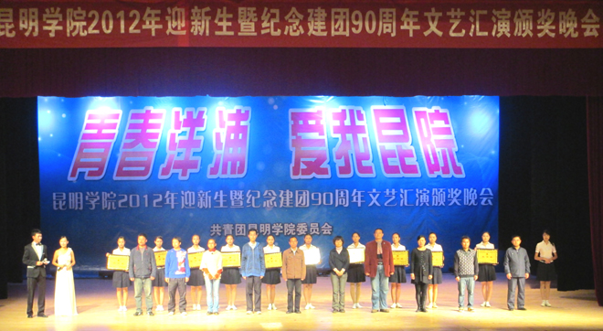 由校团委主办的“2012年迎新生暨纪念建团90周年文艺汇演颁奖晚会”于11月上旬在学生会堂隆重举行。学校党委副书记孙勇、副校长刘海发,武警边防部队士官学校副校长苏强大校,武警边防部队士官学校训练部部长李荣大校,昆明市拓展文化协会副会长、原江川武装部政委于习录上校,东方毅集团总裁助理王灏茗等领导出席晚会。学校部分中层干部、团委全体干部、各院系团总支书记,武警边防部队士官学校中层干部及200余名学员,新葡萄官网师生代表共1300余人参加了本次活动。