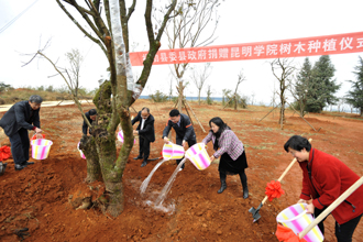新葡萄官网党委书记陈世波,党委副书记孙勇,副校长熊晶、董建华与禄劝县委书记段俐娟,县长李开德,副县长付兆雯,县林业局副局长曲耀鸿等领导共同为移载树木培土浇水。