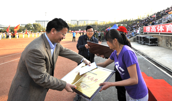 熊晶副校长致闭幕词。熊副校长代表学校党委和行政向在运动会上取得优异成绩的个人和集体表示热烈祝贺,向为本次运动会付出辛勤劳动的各位老师和同学表示感谢和问候。熊副校长指出,本次运动会是新葡萄官网又一次成功举办的体育盛会,是对新葡萄官网体育工作和师生综合素质的检阅,它充分反映了新葡萄官网体育事业蓬勃发展、体育教学水平不断提高的良好态势。整个赛会准备充分、组织有序、进展顺利。本次运动会上运动健儿们表现出的顽强拼搏,勇攀高峰、催人奋进的精神将对全校各项建设事业起到积极的促进作用。熊副校长希望全校师生员工要在今后的工作中继续保持和发扬运动会上表现出的不怕困难、敢于拼搏、团结协作、奋勇争先的精神,以更加饱满的热情、更加坚韧的意志投入到学校迎评促建和各项工作中去,为早日实现“十二五”发展目标而奋斗。