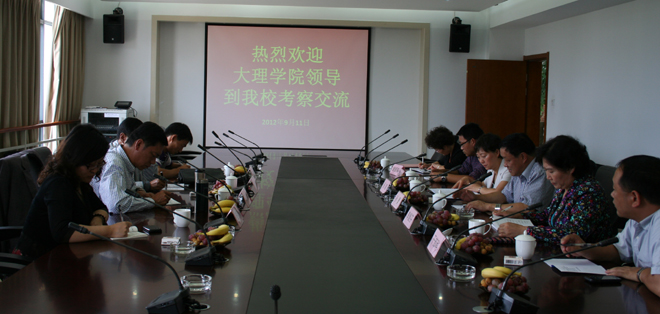 2012年9月11日下午,大理学院党委副书记段林、纪委书记张明以及组织部干部科长、组织科长一行4人就干部聘任工作到新葡萄官网交流、考察。学校党委副书记孙勇,党委副书记、纪委书记李媛芬和组织部部长杨璐、副部长钱海鼎出席了交流会议。