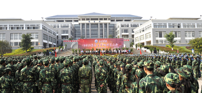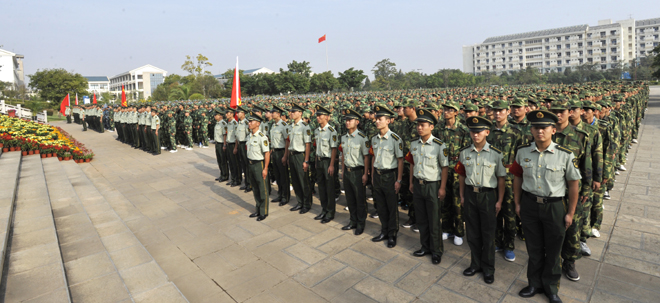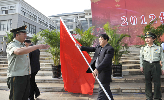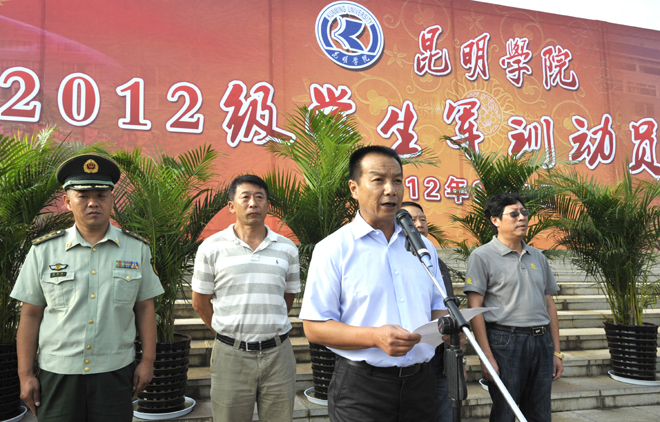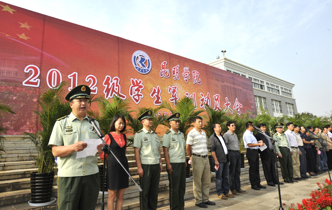 9月4日上午,新葡萄官网2012级学生军训动员大会在聂耳广场举行。武警边防部队士官学校训练部部长李荣,学生军训团团长陈应海、副团长申仕兵,继续教育处处长孙利辉,信息技术系主任赵立志,学校党委副书记、国防教育委员会主任孙勇,副校长、国防教育委员会副主任李翔,学校国防教育委员会全体成员,各院(系)主管学生工作领导,带队辅导员、全体承训官兵和2012级4600余名参训同学参加了动员大会。大会由副校长李翔主持。