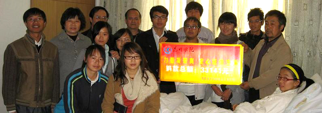 各院系的学生代表带着新葡萄8883官网AMG师生的爱心和良好祝愿看望了缪信合同学,大家跟她说:“你是我们新葡萄8883官网AMG的一员,因此你不是一个人,我们和你在一起。”并转交了总额为人民币33141元的爱心捐款,缪信合非常感谢学校对自己的关心,表示自己一定努力配合治疗,争取早日到校和同学们一起学习、一起生活,以报答学校、老师和同学对她的关心和帮助。