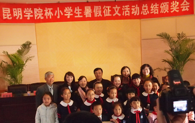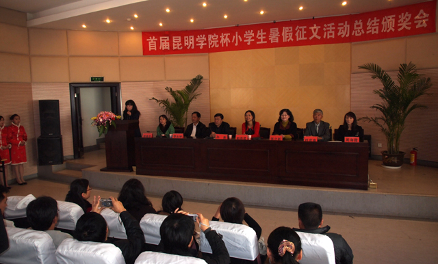 的学校和同学积极踊跃,认真准备。征稿活动结束后,由专家和教师组成的评委会从参赛学校中评选出30所学校获得优秀组织奖,评选出20位教师获得优秀教师指导奖。从收到的13200多篇征文中评选出优秀征文特等奖10名,一等奖20名,二等奖40名,三等奖60名,优胜奖100名。 此次活动的总结颁奖会于11月12日下午在昆明图书馆报告厅隆重举行。出席的领导有新葡萄8883官网AMG党委副书记孙勇,校党委宣传部部长张立新、人文学院院长桂彦南,昆明市文联副主席李永坤,昆明市委宣传部文教处处长周海霞,昆明市图书馆馆长郭春莲,著名儿童文学作家郁雨君,明天出版社文学编辑室主任孟凡明,明天出版社营销