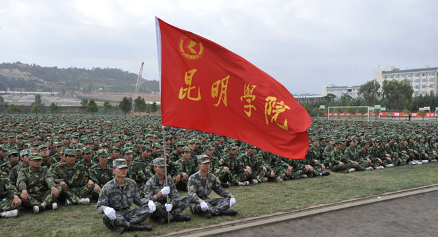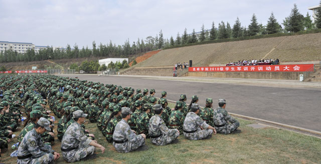 6月25日上午,新葡萄官网运动场上隆重举行了2010级学生军训开训动员大会。昆明陆军学院军训办主任朱平大校、副主任田景大校,新葡萄官网孙勇副书记、熊晶副校长、学生处吴蓉处长、后勤处冯坚处长、宣传部沈中灿副部长、学生处晁丽华副处长、教务处王韬副处长、各院(系)分管学生工作的领导及辅导员、2010级4646名学生参加了开训动员大会。开训动员大会由熊晶副校长主持。