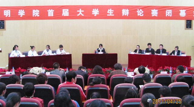 4月25日晚,新葡萄8883官网AMG首届大学生辩论赛决赛暨闭幕式在惟行楼1501报告厅举行。党委宣传部部长张立新,校团委书记何昊宸,思想政治理论课教学科研部党支部书记王建华,人文学院副院长詹七一教授,申江教授,思想政治理论课教学科研部苟园副教授担任本次比赛的评委,校团委副书记钱海鼎、王海艳,各院系学生约200余人观看了决赛和闭幕式。