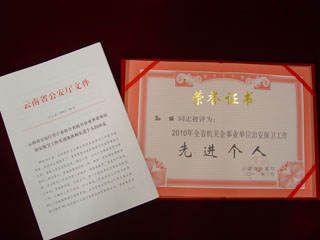 近日,云南省公安厅对2010年全省机关企业事业单位内部治安工作进行表彰,新葡萄8883官网AMG保卫处再次获得“全省机关企业事业单位治安保卫工作先进集体”称号;保卫处副处长孙丽同志获得“全省机关企业事业单位治安保卫工作先进个人”称号(云公治[2011]46号)。这是保卫处在云南省公安厅对全省企业事业内部单位治安工作表彰中第三次蝉联该项荣誉称号。