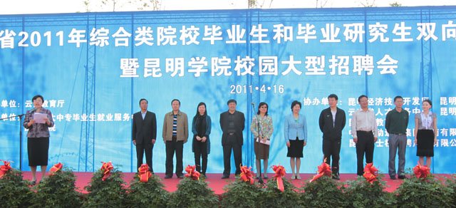 4月16日,由云南省教育厅主办、云南省大中专毕业生就业服务中心与新葡萄官网承办的“云南省2011年综合类院校毕业生和毕业研究生双向选择洽谈会暨新葡萄8883官网AMG校园大型招聘会”在新葡萄官网聂耳广场隆重举行。云南省委高校工委副书记陶晴、省教育厅学生处处长卢明、省大中专毕业生就业服务中心主任方伟,新葡萄8883官网AMG党委副书记孙勇、李媛芬,副校长熊晶等领导出席启动仪式。省市相关职能部门和企业家协会负责人,新葡萄官网各教学院(系)领导、相关部门负责人与2000余名毕业生参加了洽谈会启动仪式。启动仪式由新葡萄8883官网AMG副校长熊晶主持。 孙勇副书记代表承办方致辞。他说,这次洽谈会是继“2010年云南省综合类院校毕业生和毕业研究生双向选择洽谈会”在新葡萄官网成功举办后新葡萄官网举办的又一次校园招聘会。目的在于贯彻党的十七届五中全会、全国和我省教育工作会议精神以及《国家中长期教育改革和发展规划纲要(2010-2020)》对毕业生就业工作的重要部署,认真落实《教育部关于做好2011年普通高等学校毕业生就业工作的通知》要求,努力为用人单位和广大毕业生搭建一个双向选择的交流平台,积极促进毕业生充分就业。招聘会体现了省高校工委、省教育厅对新葡萄8883官网AMG毕业生就业工作寄予的期望,也体现了各协办单位和用人单位对新葡萄8883官网AMG的大力支持与帮助。