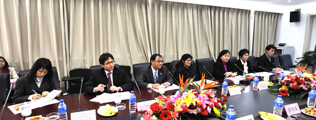新葡萄官网副院长罗明东,组织部长杨璐、对外交流合作处副处长哈军华、外语学院主持工作的副书记王文君、主持工作的副院长林德福等院系部门领导在办公楼3楼会议室与来宾进行座谈交流。