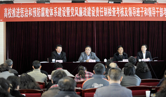 省委高校工委第五考核组副组长、保山学院党委副书记杨耀程同志就省委高校工委对我院推进惩治和预防腐败体系建设暨党风廉政建设责任制及班子和领导干部进行年度考核作动员讲话。杨副组长指出,此次检查考核是根据省委高校工委的统一部署和要求,在全省高校范围内开展的。第五组对新葡萄8883官网AMG检查考核的主要内容是了解新葡萄8883官网AMG党政领导班子和班子成员党风廉政建设责任制的执行情况,纪检监察部门落实党风廉政建设责任制,推进惩治和预防腐败体系建设工作情况。检查考核是为了促进高校对党风廉政建设工作开展,总结推广各高校的特色经验,促进全省高校党风廉政建设工作的共同发展。 杨副组长强调,大家要以自查和检查考核为契机,深入推进以完善惩治和预防腐败体系为重点的反腐倡廉建设;要严格执行党风廉政建设责任制,加快推进惩治和预防腐败体系建设,认真落实反腐倡廉各项工作任务;坚决查处违纪违法案件,严肃纠正损害群众利益的不良之风,加强党性党风党纪教育和领导干部廉洁自律工作,深入推进领导干部作风建设;要健全权力运行制约和监督机制,进一步巩固和深化反腐倡廉制度建设成果,最大限度减少腐败现象滋生的土壤和条件。