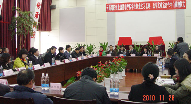 | 经新葡萄8883官网AMG与昆明国家经济技术开发区管委会、科技园区的友好协商,云南海归创业园“新葡萄8883官网AMG学生创业实习基地”和“联合实验室”揭牌仪式于11月26日下午在经开区创业大厦举行。我院陈世波院长,熊晶、罗明东副院长率院办、人事处、招就处、宣传部主要负责人与涉及经济、旅游、社会管理、理、工、农、医等学科的教学单位主任(书记)20余人参加了揭牌仪式。
