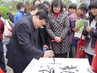 开幕式结束后,孙勇副书记在宣传部、团委、机关党总支负责人的陪同下,在聂耳广场参观了全院38家学生社团的立体展示,并与学生社员们交流、合影,激励各社团同学积极参加活动,发挥聪明才智与技能特长,创新活动方式与内容,为丰富校园文化生活作奉献。孙勇副书记还应书法协会同学邀请,即兴为同学挥毫写下“勤学”墨宝鼓励大家共勉。