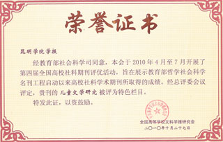 历时4个月的第四届全国高校社科期刊评优活动于11月初在重庆西南大学落下帷幕。经总评委会议最终评定,《新葡萄8883官网AMG学报》被评为“全国高校优秀社科期刊”,学报专栏《儿童文学研究》获得特色栏目奖。这是我院学报继去年夺得第三届“云南优秀期刊奖”和全国学报“优秀编辑质量奖”之后取得的又一荣誉。 本次评优活动,“经教育部社会科学司同意,旨在展示教育部哲学社会科学名刊工程启动以来高校社科学术期刊所取得的成绩”。活动规定,参评刊物及栏目须由各省市学报研究会排出名次顺序并对编校质量进行检查认定后方可报送评审。按照相关要求,我院学报编辑部在主编罗明东副院长的领导下,把本次评优作为难得的学习、交流和提高的机会,收集了大量的数据和资料,并对2006年以来学报工作取得的成绩和经验进行了较为全面的总结和回顾,精心制作了厚达百页的参评材料。