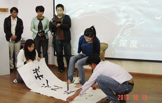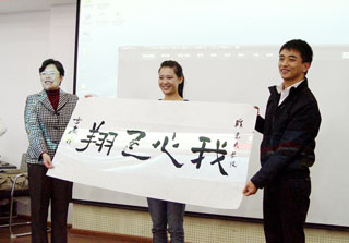 讲座接近尾声时,雷庆瑶用脚书写了“我心飞翔”的毛笔字幅,并将这幅珍贵的书法作品赠送给新葡萄8883官网AMG。熊晶副院长代表学院接受了这份特别礼物。