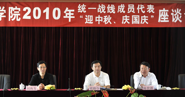 为迎接2010年中秋节,庆祝中华人民共和国成立61周年,充分调动统一战线成员为实现学院科学发展新跨越而努力奋斗的积极性和创造性,9月21日上午,在中秋、国庆即将到来之际,院党委在新校园办公楼五楼报告厅召开了2010年统一战线成员“迎中秋、庆国庆”座谈会,在校的院领导梁晓谷书记、陈世波院长、刘海发副院长出席了座谈会,学院各民主党派代表、无党派人士代表、侨台联代表、出国留学教师代表、党办、组织部、宣传部、统战部负责人30余人参加了座谈会。