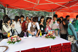 鸡尾酒会上一桌陈列有 “香水有毒”、“海洋之心”、“风花雪月”、 “甜蜜”、“七彩云南”、“绿野仙院”、“雀之灵”、“阳春白雪”、“日出”、“紫色遐想”、“旭日东升”等多种具有鲜明特色的鸡尾酒展现在众人面前。迎着杯中散发的阵阵幽香,赏着那精美绝伦的鸡尾酒,来宾们给予了称赞与好评。在鸡尾酒会的现场,同学们还表演了花式调酒,娴熟的技艺、另人眼花缭乱的表演赢得在场领导及师生的热烈掌声。在这样一个具有独特、创新与超越相结合的艺术时刻,热烈的掌声和欢呼声此起彼伏,观众们争相用相机、手机留下了这一美的瞬间。