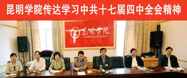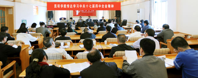 中国共产党第十七届中央委员会第四次全体会议于9月15日至18日在北京举行。出席这次会议的有中央委员193人,候补中央委员163人。中央纪律检查委员会委员和有关方面负责同志列席会议。党的十七大代表中部分基层党务工作者、基层党员和从事党建工作研究的专家学者也列席了会议。全会由中央政治局主持。中央委员会总书记胡锦涛作了重要讲话。全会听取和讨论了胡锦涛受中央政治局委托作的工作报告,审议通过了《中共中央关于加强和改进新形势下党的建设若干重大问题的决定》。习近平就《决定(讨论稿)》向全会作了说明。 党的十七届四中全会结束后,中共云南省委、昆明市委迅速召开干部会传达会议精神。我院党政主要领导参加了省市传达中央精神会议后,于9月24日召集党委会,专题研究部署全院传达学习、贯彻落实十七届四中全会精神相关工作。