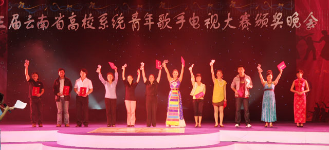 颁奖晚会于7月5日在云南艺术学院实验剧场隆重举行,李媛芬副书记代表学院出席了颁奖晚会。根据中共云南省委高校工委和云南省教育厅的安排,获奖选手将以云南省高校艺术团的名义到省内部分高校进行10场巡回演出,掀起我省高校迎国庆60周年系列庆祝活动的高潮。