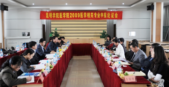 原昆明市卫生学校校长余珊代表学院在论证会上作分析汇报。汇报从我国护理、助产、药学、医学检验技术专业人才队伍数量、学历现状及需求情况分析人手,表明我院申报1个本科、4个专科的理由和条件及五年发展计划、专业发展规模及目标等方面,已基本具备,可以申报。