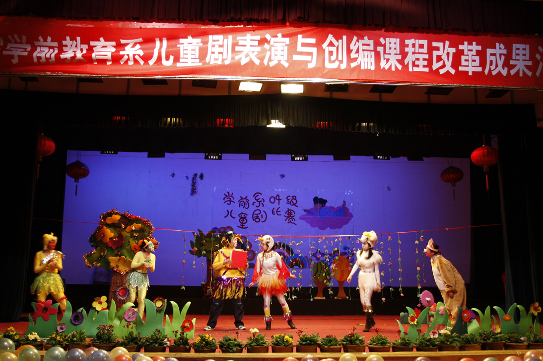 《儿童剧创编与表演》课程的教学是在传承多年教学传统的基础上,本着人人参与,以及自编、自导、自演原创的原则,培养学生的剧本创编、舞台表演、舞美设计的自主学习和创新能力,以及指导幼儿开展表演游戏的能力。同时,也为学生搭起一块展示综合素养和技能的平台,在学前系已形成一种特有的校园文化现象。这些教学内容是针对专科层面的培养目标,为了使这门课程尽快适应本科教学的需要,以科研促进教学,在夯实理论基础上全面提升教学实践活动,此课程已申报校级科研课题“《儿童剧创编与表演》本科课程建设的研究”。目的是在这一独特的领域作更新、更深入的研究,使之真正成为新葡萄8883官网AMG的一门优势学科。