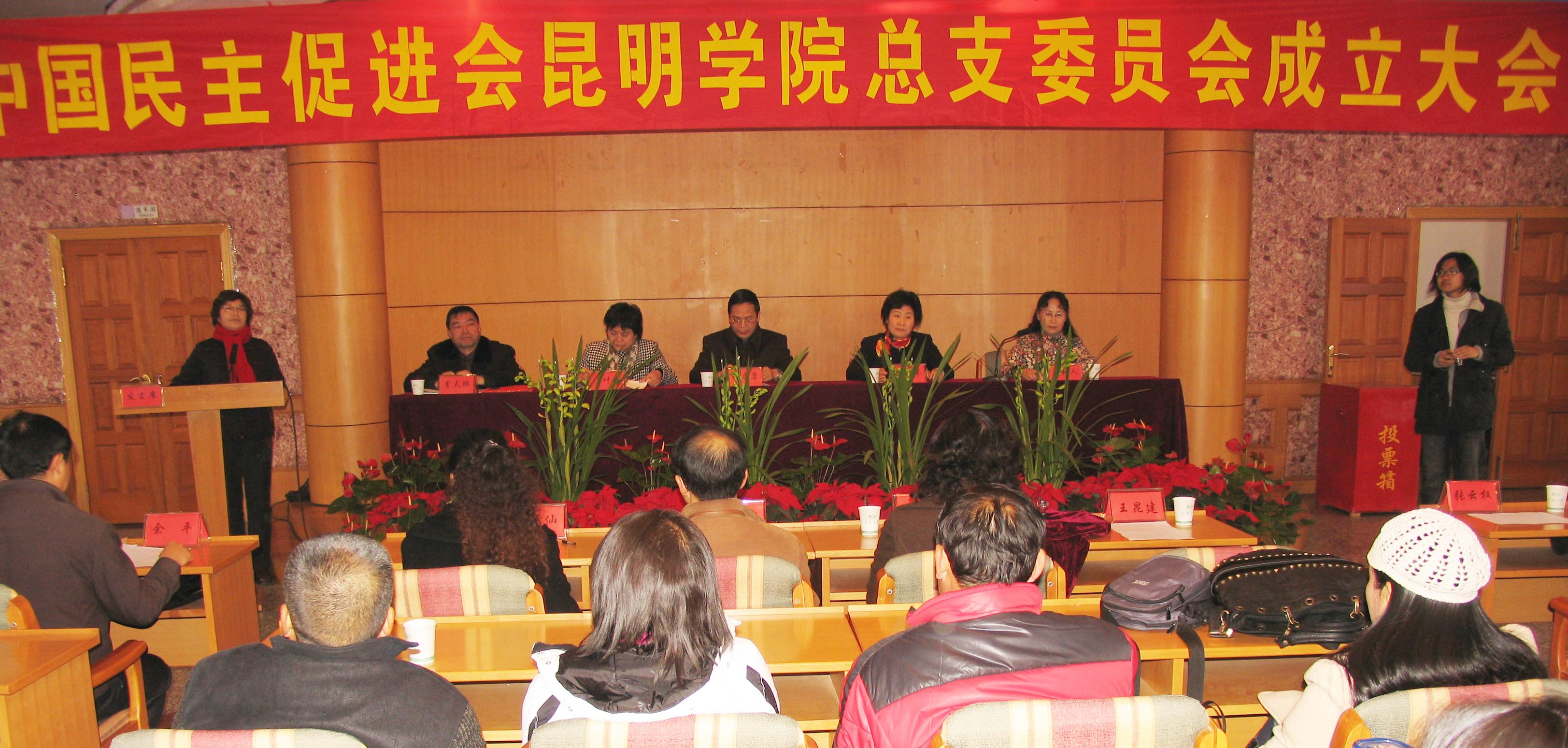 在民进云南省委、昆明市委的领导和新葡萄8883官网AMG党委的指导下,在民进新葡萄8883官网AMG全体会员的努力下,2008年12月6日,民进新葡萄8883官网AMG第一届总支委员会成立大会胜利召开。出席大会我院应到会员70余人,实到会与委托投票会员61人。应邀出席成立大会的来宾有民进省委副主委陈友康、中共昆明市委统战部副部长贾天鹏、中共新葡萄8883官网AMG党委副书记李媛芬及统战部负责人,新葡萄8883官网AMG民革、民盟、致公党、九三学社的代表也应邀出席了大会。