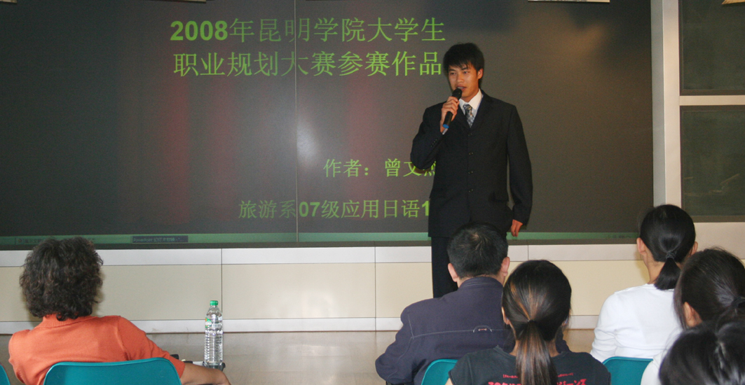 20081020日旅游系第二届职业生涯规划大赛在旅游系模拟导游实验室举行。此次活动邀请到学院学生处就业指导中心的老师出席,旅游系杨璐老师、唐嘉萍老师、08级部分辅导员及0708各班班主任参加。参加比赛的是经过各班推选、旅游系初评后入围的9名同学。