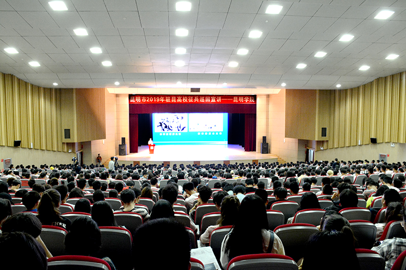 5月24日,2019年驻昆高校大学生征兵巡回宣讲在新葡萄8883官网AMG学生会堂举行。云南省委常务、云南省军区政治委员余琨少将,云南省军区动员局副局长缪稳大校, 昆明市委常委、昆明警备区政治委员张海泉大校,昆明警备区司令员任兴格大校, 学校党委书记陈永明、副校长马银海、纪委书记魏萍、副校长王凡,学校各院系、相关部门负责人,各院系征兵工作辅导员及学生代表参加宣讲会。