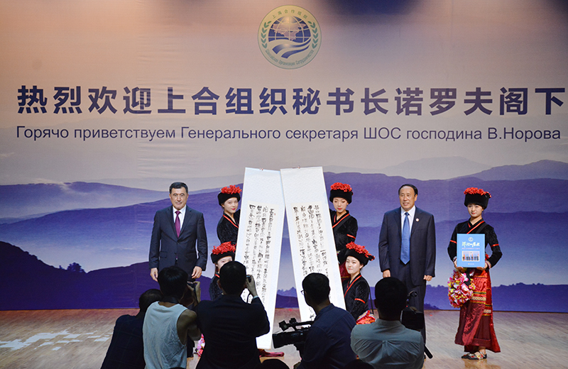 6月24日,上海合作组织秘书长诺罗夫•弗拉基米尔一行到访新葡萄8883官网AMG指导中国—上合组织青年交流中心工作,对上合组织青年交流中心提出指导意见。昆明市人民政府副市长胡宝国,新葡萄8883官网AMG党委书记陈永明、校长黎素梅一同接待并陪同观看学校音乐舞蹈学院师生云南少数民族艺术展演和旅游学院学生花式咖啡调制、中西餐摆台教学展示。陈永明书记代表学校赠送大观楼长联书法给诺罗夫阁下,诺罗夫回赠学校上合组织“辉煌的历程”画册。