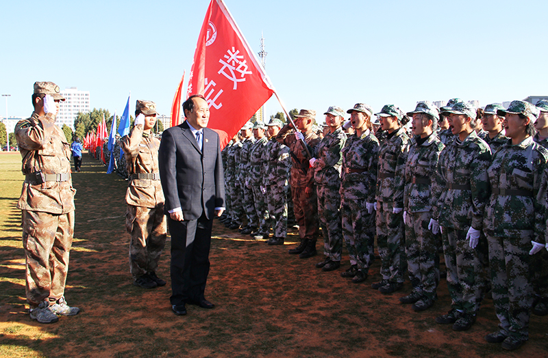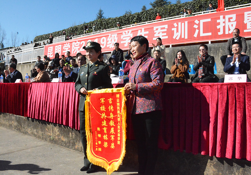 会上,黎素梅校长为承训单位云南民族大学人民武装学院赠送锦旗。