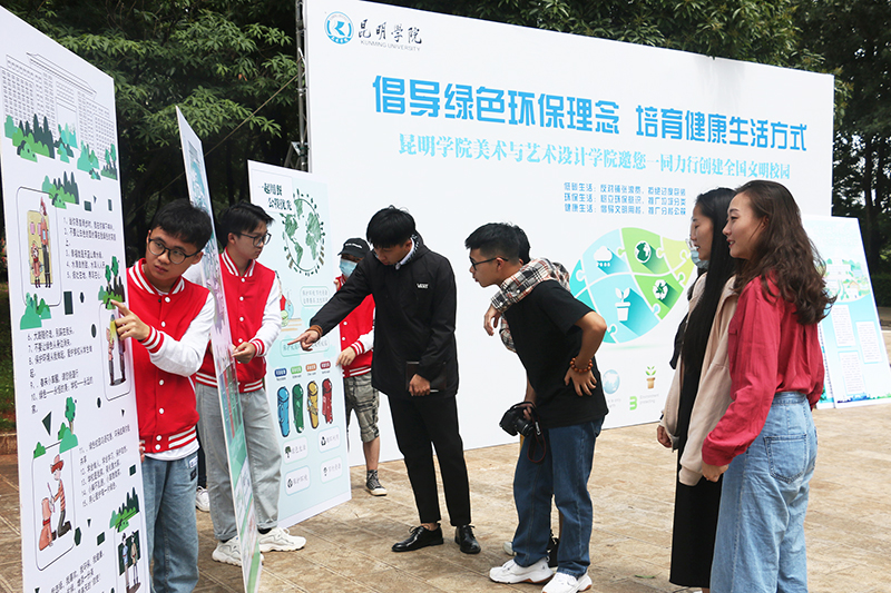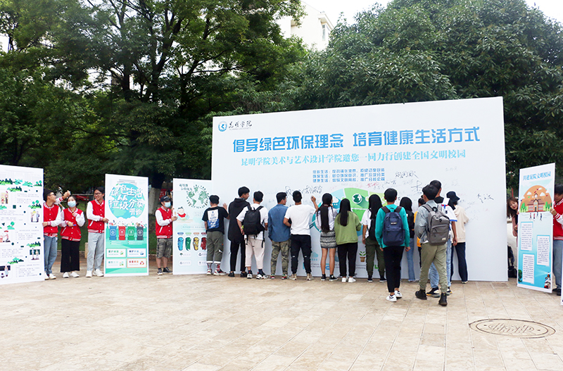 主题宣传活动,通过展示美术与艺术设计学院师生创作的“文明健康 有你有我”公益宣传展版、发放健康生活宣传页、现场讲解绿色环保知识、低碳环保我践行签名、与绿色生活同框拍照等方式向师生进行绿色环保、健康生活知识宣传。倡导师生树立节约意识,积极践行低碳生活,反对铺张浪费,拒绝过度包装;在生活中从节约一度电、一滴水、一张纸做起,养成简约适度的消费习惯。倡导师生树立绿色环保理念,积极践行绿色消费,主动参与垃圾分类,在日常消费中选购绿色、环保、可循环产品,减少使用一次性筷子、纸杯、塑料袋等制品。倡导师生养成健康生活习惯,出门佩戴口罩、保持社交距离、推广分餐公筷、看病网上预约等健康生活社会新风尚。