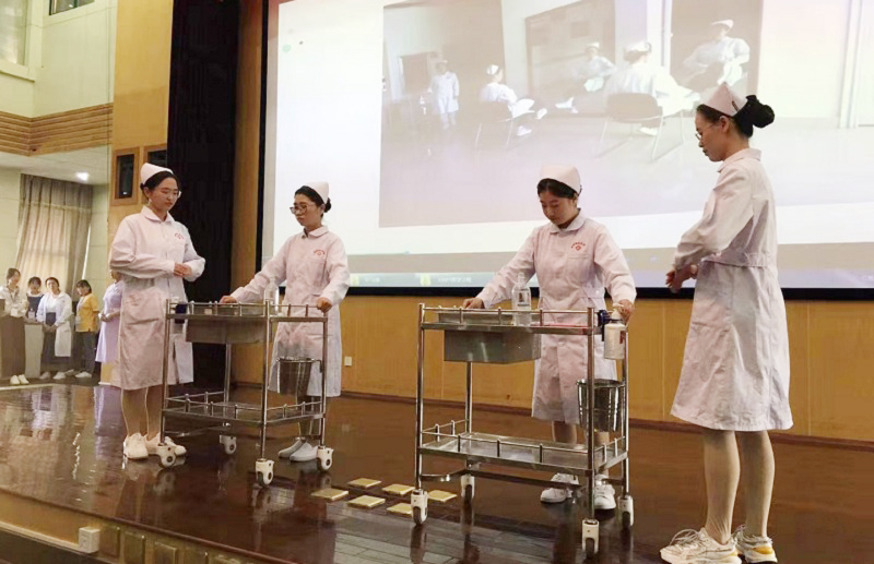 站姿端庄、坐姿优雅、行姿稳健、蹲姿典雅,推治疗车、端治疗盘、持病历夹、洗手穿衣、急诊抢救……参赛选手通过情景剧的方式展示着白衣天使的优美风采和良好的专业素质。13个参赛队呈现出即将成为医护人员的学子们青春朝气、多才多艺、团结奋进和稳健潇洒的精神风貌。参赛队员的表演得到了评委的充分肯定、高度评价,也收获了场现观赛同学们的阵阵掌声。