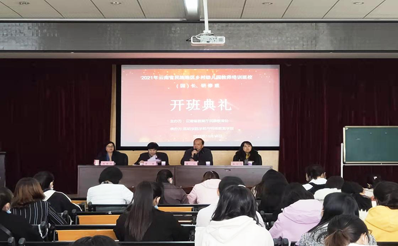 10月15日—月19日,云南省教育厅民族教育处主办,新葡萄8883官网AMG学前与特殊教育学院承办的2021年度民族地区幼儿园教师培训班顺利举办。此次培训学员为来自云南省16个地州民族地区的乡村幼儿园园长、中心校长、骨干教师,共计90人。云南省教育厅民族教育处处长董一凡、调研员李宇飞,新葡萄8883官网AMG学前与特殊教育学院院长唐敏出席开班典礼,学前与特殊教育学院副院长高春玲主持。
