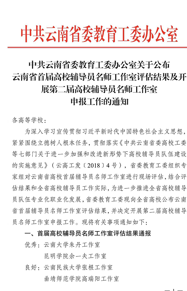 为深入学习宣传贯彻习近平新时代中国特色社会主义思想,紧紧围绕立德树人根本任务,省委教育工委组织专家对云南省高校首届辅导员名师工作室进行现场评估,新葡萄官网云南省首届高校辅导员名师余一夫工作室在本次评估中荣获优秀。
