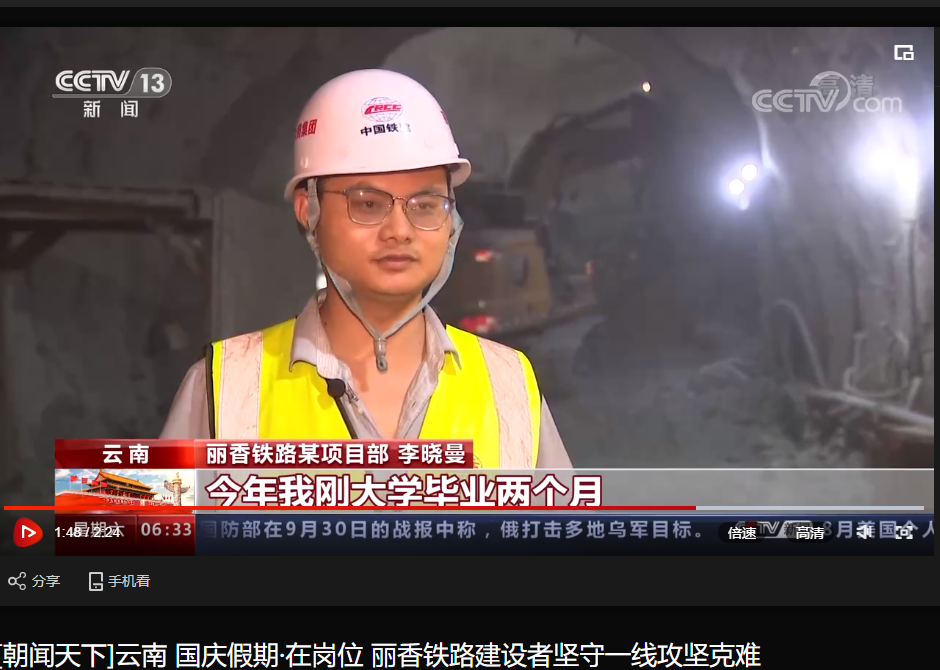 国庆期间,央视新闻频道《朝闻天下》栏目采访报道了国庆假期坚守在丽香铁路一线攻坚克难的建设者们。目前就业于中铁十六局集团第三工程有限公司的新葡萄官网建筑工程学院2022届土木工程专业毕业生李晓曼在新闻中出镜并接受采访。他说:“一代人有一代人的担当,一代人有一代人的使命,我们就应该为祖国建设添砖加瓦、为民族复兴架桥修路。”