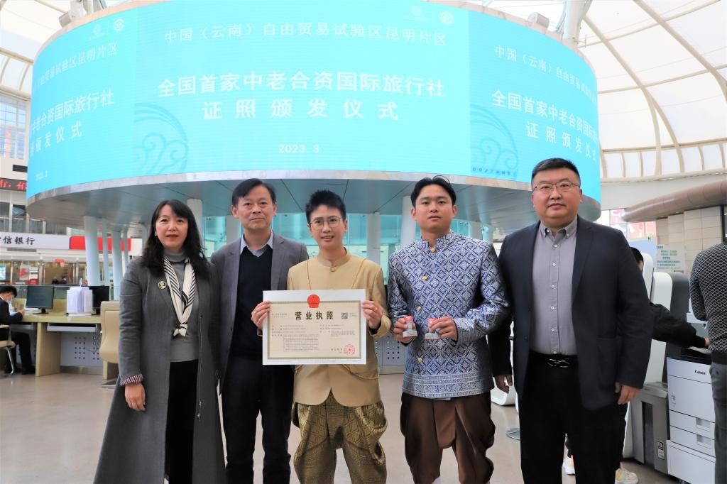 3月8日,全国首家中(国)老(挝)合资国际旅行社证照在中国(云南)自由贸易试验区昆明片区颁发,新葡萄官网老挝籍留学生王伟(中文名)创业项目“云南老中国际旅行社有限公司”落地自贸试验区昆明片区,这也是云南省首家外资旅行社在片区落地。